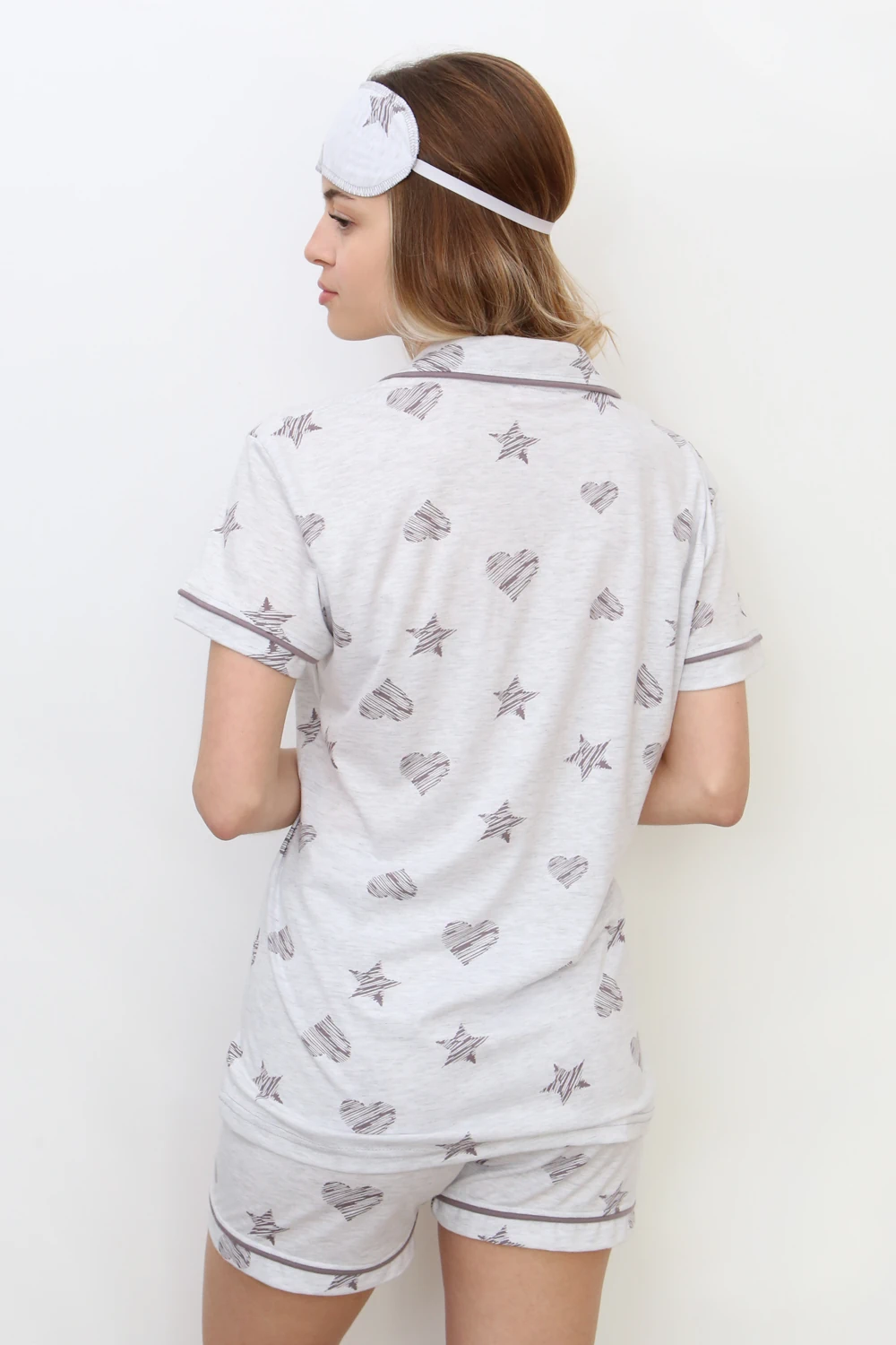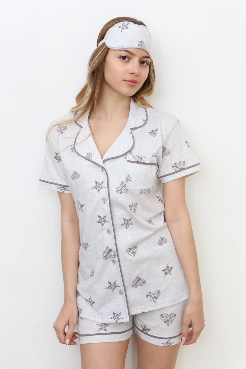 Κοντομάνικο πουκάμισο βαμβακερό με κουμπιά, γιακά και τσεπάκι. Το σορτσάκι είναι εξίσου βαμβακερό, διαθέτει λάστιχο στη μέση και κορδονάκι που δένει. Η μάσκα ύπνου είναι και αυτή βαμβακερή.