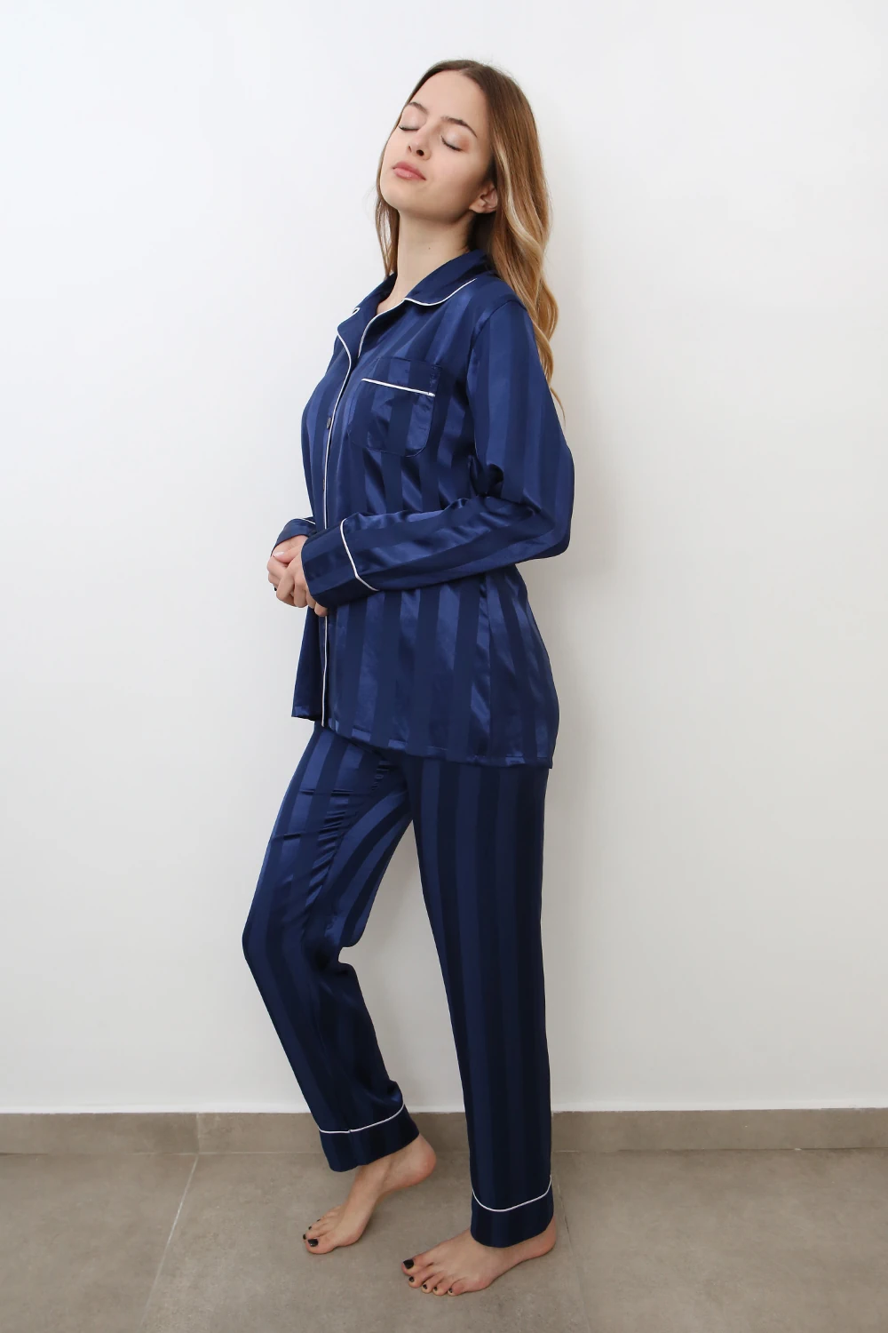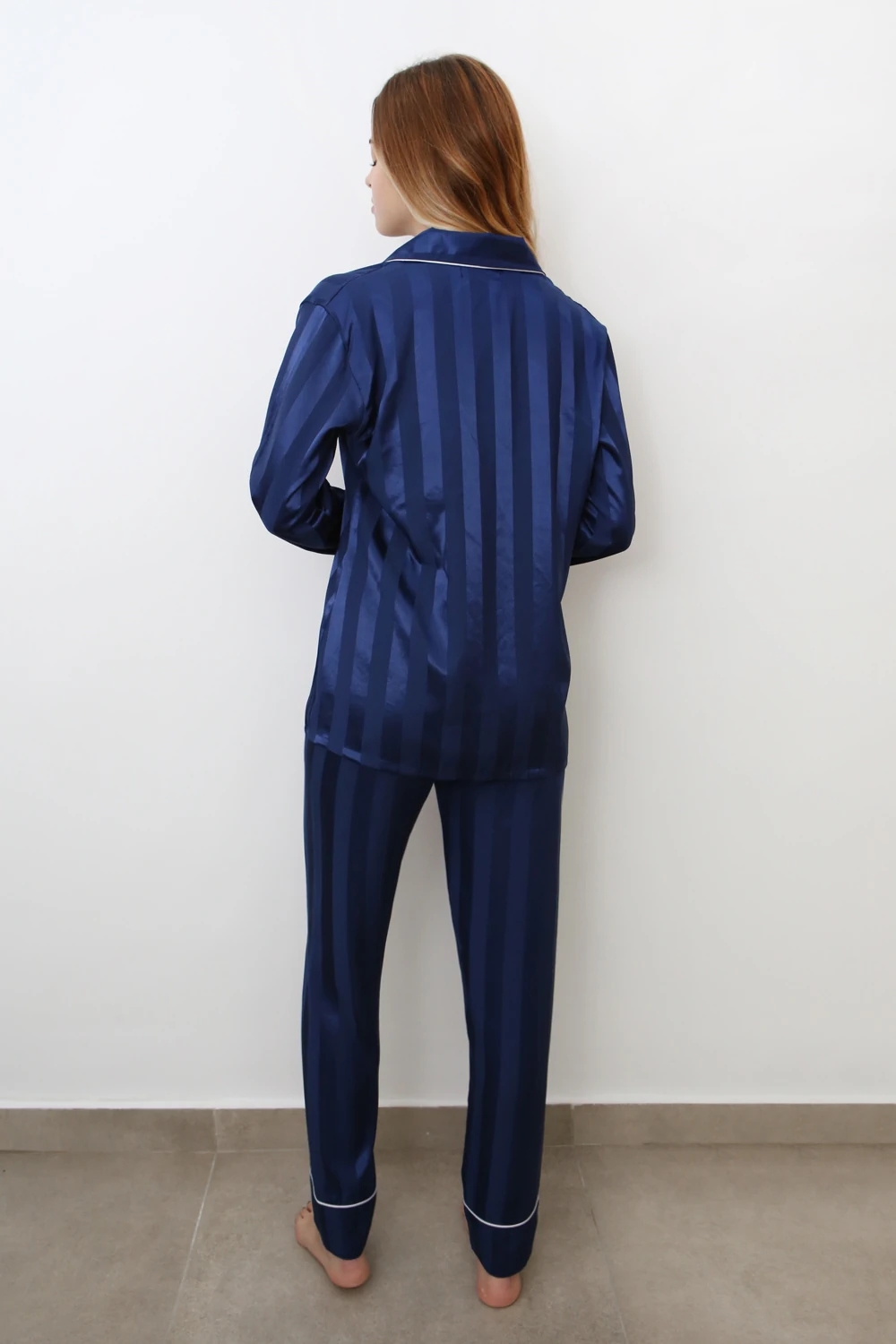 Σετ Πιτζάμα Σατέν με Πουκάμισο Ριγέ – Μπλε